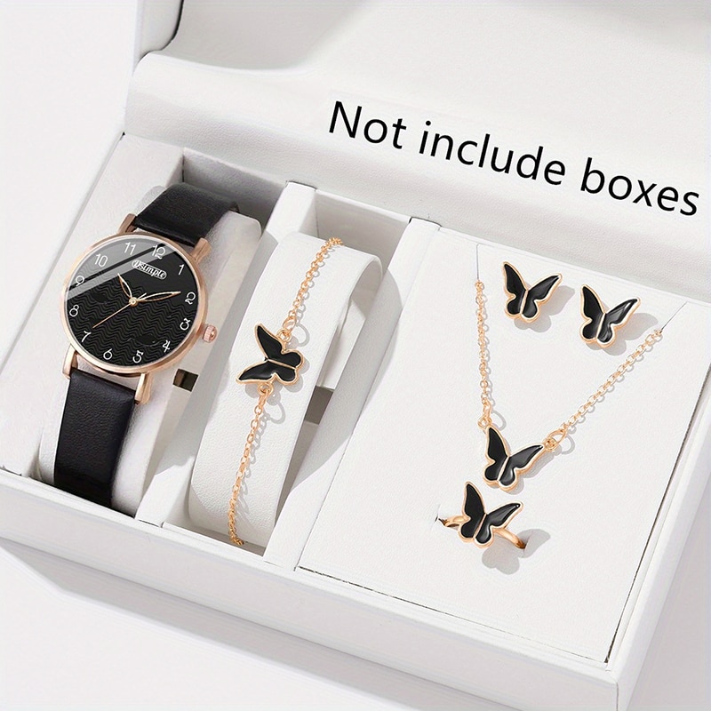 One collection stood out: a six-piece set featuring a black leather watch with an elegant butterfly dial, complemented by matching jewelry. The price seemed almost unbelievable. Though skeptical, the clear product images and straightforward description conveyed style without the luxury markup.