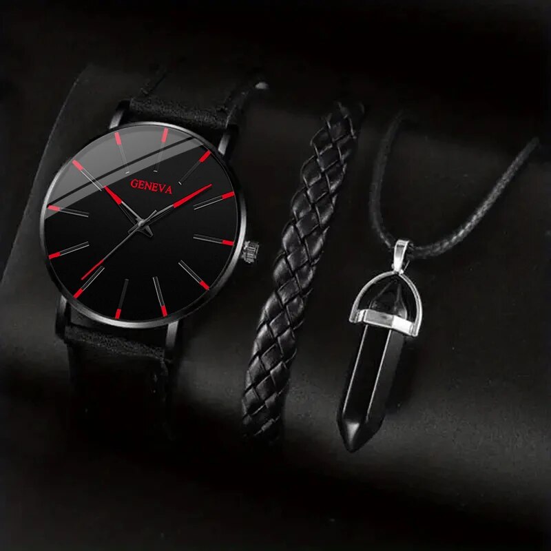 You can find the product here: 3pcs Set Mens Watches Luxury Casual Leather Quartz Wristwatch Men Business Sports Wrist Watch Bracelet Necklace Set